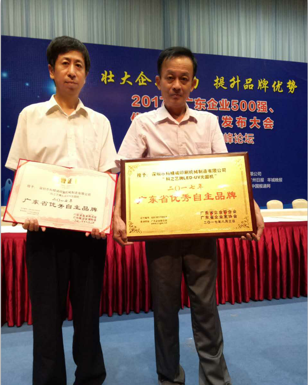 2017年8月3日,由廣東省企業(yè)聯(lián)合會、廣東省企業(yè)家協(xié)會舉行的廣東企業(yè)500強、優(yōu)秀自主品牌發(fā)布會中,深圳市科精誠印刷機械制造有限公司旗下品牌——科之藝以卓越的表現(xiàn)從數(shù)千家品牌中脫穎而出,榮獲“2017年度廣東省優(yōu)秀自主品牌”稱號。這是對“科之藝”多年來堅持自主創(chuàng)新,努力拼搏,持續(xù)打造產(chǎn)品核心競爭力,積極培育優(yōu)秀自主品牌的高度肯定和認(rèn)可。